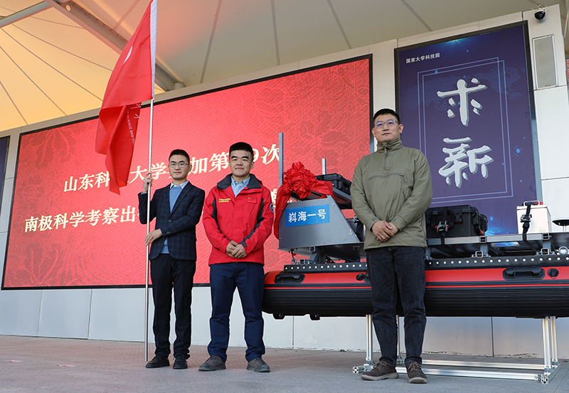 出征仪式上,北京海卓同创科技有限公司捐赠了科考设备,张建为科考队员授旗,与会领导启航“嵙海一号”,共同祝愿科考队员用实际行动向祖国极地科考事业交出一份满意答案。