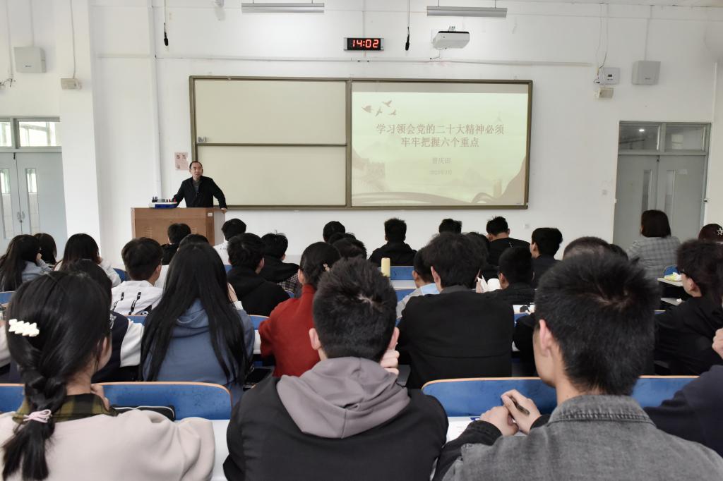 授课过程中,曾庆田将党的二十大精神与学校办学发展理念、自身工作学习体会和当代大学生成长成才目标紧密结合,要求同学们通过不断深入学习领会党的二十大精神核心要义,坚定理想信念,厚植红色基因,争做堪当大任的时代新人;要将二十大报告中的新思想、新理论、新方法和新要求,学深悟透用实、入脑入心践行,为自身成长导航助力;要运用党的二十大精神武装头脑,坚持问题导向,不断守正创新,奋力谱写人生新篇章。