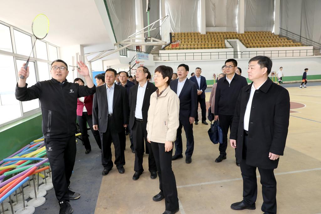 调研组一行先后到排球场、体育馆、图书馆、学生宿舍等场地,实地查看校区体育课程教学、体育活动开展、心理健康教育场所建设等基本情况,详细了解泰安校区促进学生体质健康的具体措施和特色工作。